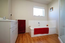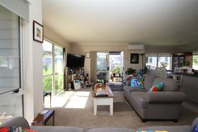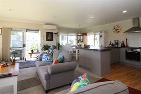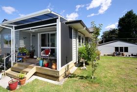 Three bedrooms, two bathrooms, open plan living opening onto covered deck.